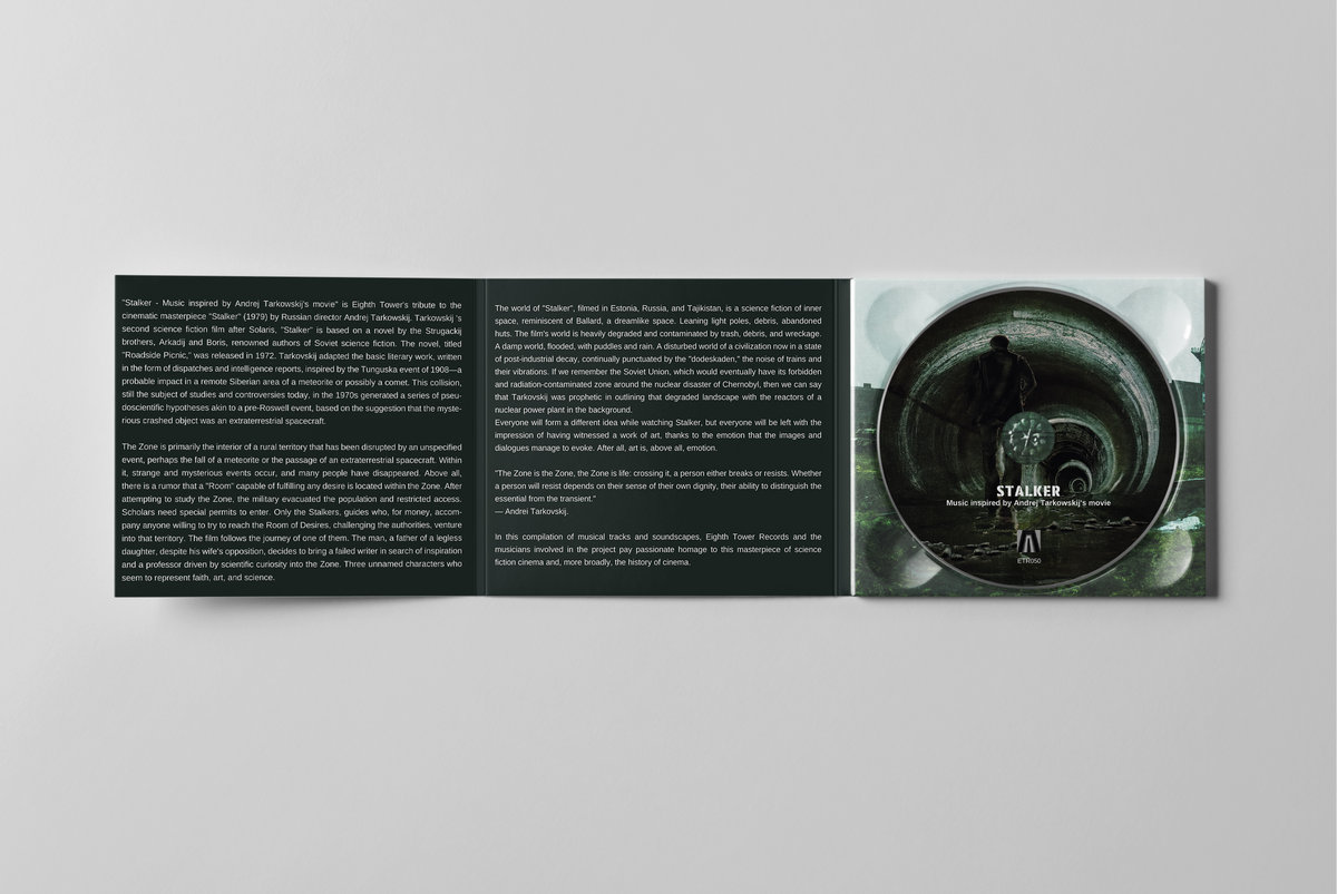 "Stalker - Stories inspired by Andrej Tarkowskij's movie" is Eighth Tower's tribute to the cinematic masterpiece "Stalker" (1979) by Russian director Andrej Tarkowskij. Tarkowskij 's second science fiction film after Solaris, "Stalker" is based on a novel by the Strugackij brothers, Arkadij and Boris, renowned authors of Soviet science fiction. The novel, titled "Roadside Picnic," was released in 1971. Tarkovskij adapted the basic literary work, written in the form of dispatches and intelligence reports, inspired by the Tunguska event of 1908—a probable impact in a remote Siberian area of a meteorite or possibly a comet.